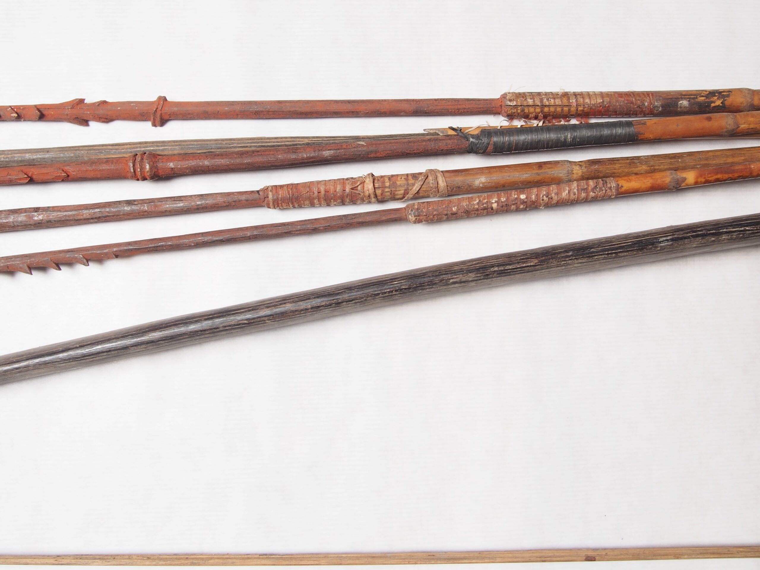 Asmat Boegen sind oft aus Schwarzplamenholz gefertigt, da diese die besten flexiblen Eigenschaften aufweisen, Pfeile fuer verschiedene Anwendungen.