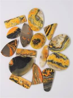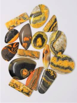 Bumblebee agate, or bumblebee jasper in various cuts and shapes. Polished surface and flat, polished base.