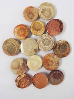 Versteinerte, rund geschliffene einzelne Korallen. Polierte konvexe Vorder- und flache Rueckseite. Schoener Kontrast und Farbspiel in bester Qualitaet. Mehrere Stuecke auf Lager, gerne nehme ich Anfragen entgegen.