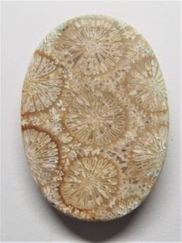 Versteinerte Koralle in Cabochonschliff (Hexacorallia) im cabochonschliff. Convexe, polierte Vorderseite und polierte, flache Rueckseite. Toller Kontrast der weissen Polypen mit umgreifendem Hellbraun in bester Qualitaet.