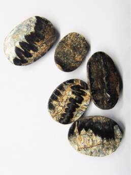 Versteinerte Stegodon Zaehne im Cabochonschliff. Polierte konvexe Vorder- und flache Rueckseite. Schwarz- bis hellgraue Faerbungen in guter Qualitaet.